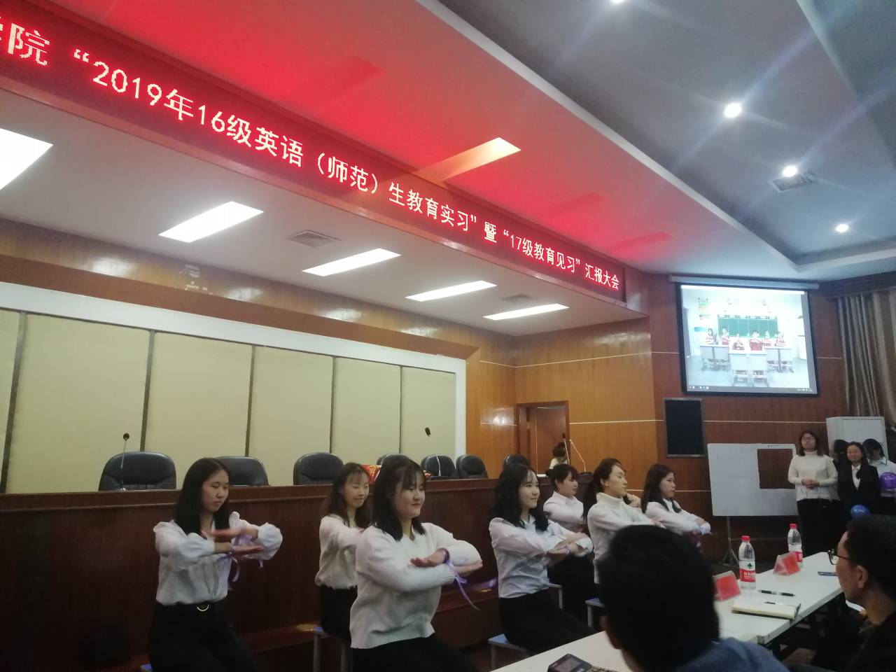 本网讯(通讯员 李干 奉洁 孙欣然 丁宇)在学院的大力支持和广大师生的共同努力下,2016级英语师范生教育实习工作圆满结束,并于12月4日晚7点在逸夫楼多功能报告厅举行了2016级英语师范生教育实习暨17级教育见习汇报大会,出席本次大会的领导及嘉宾有外国语学院汤敬安院长、教研室主任刘燕老师、翻译系龙鹏屹老师、教务办窦文祥老师,2016-2017级全体师范学生。