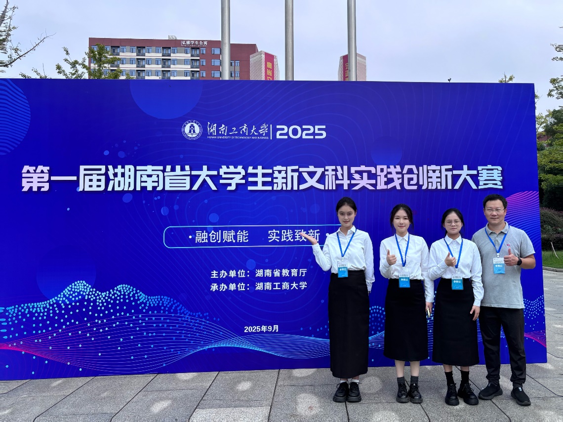 本网讯(通讯员 施玲丹)9 月 26 日至 27 日,湖南省第一届大学生新文科实践创新大赛决赛在湖南工商大学举行。我院 23 级商务英语施玲丹、胡雨欣、刘欣璐、陈海莉四人组成的团队,历经两天的激烈比拼,成功斩获省赛金奖