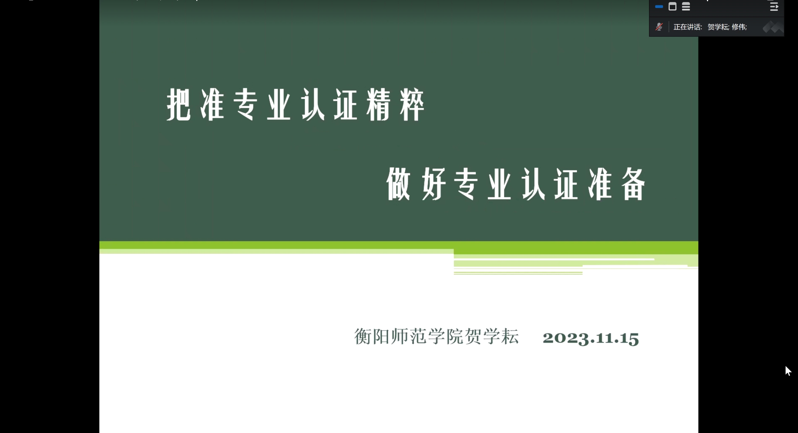 贺学耘教授的主讲题目是《把准专业认证精粹 做好专业认证准备》,她从专业认证的基本原理解读开始,介绍了师范类专业认证的核心理念,回顾了衡阳师范学院必威bway专业认证准备和措施,讲解了如何设定课程目标,并以案例形式分享了该校如何在课程教学中体现专业认证的学生中心、产出导向、持续改进理念。