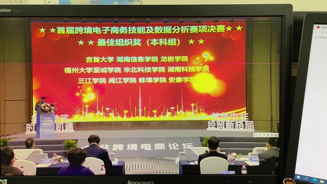 2022年第六届一带一路暨金砖国家技能发展与技术创新大赛由金砖国家工商理事会主办、中国(金华)跨境电商综合试验区协办,今年首次设立跨境电商技能及数据分析赛,助力“数字丝路”建设,推动中国与“一带一路”国家跨境电商发展,引导适应全球数字经济需要的创新型人才培养。此次大赛分为国内赛和国际赛,国内赛前两名获奖队伍代表中国参加2023年在南非举办的国际赛。大赛于6月启动,全国共有600余支本科队伍报名参赛。我院以28名商务英语专业学生为骨干,跨学科组建11支队伍、共33名同学参赛。其中8支队伍通过跨境电商知识理论赛、模拟实践赛,成功晋级复赛,2支队伍成功晋级决赛。决赛共有全国各级各类高校100支队伍参加,前10名授予一等奖。我院两支参赛队各自经过八个半小时不间断协作,按时提交数据分析报告并获得第二天的团队答辩资格,最终荣获一等奖、二等奖各1项。我校也因初赛、复赛、决赛的组织工作以及参赛团队的优秀成绩被主办方授予最佳组织奖。11月18日在浙江金华举办的“中非跨境电商论坛”开幕式上,组委会专门为决赛获奖团队及优秀组织单位举行了颁奖仪式。