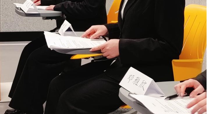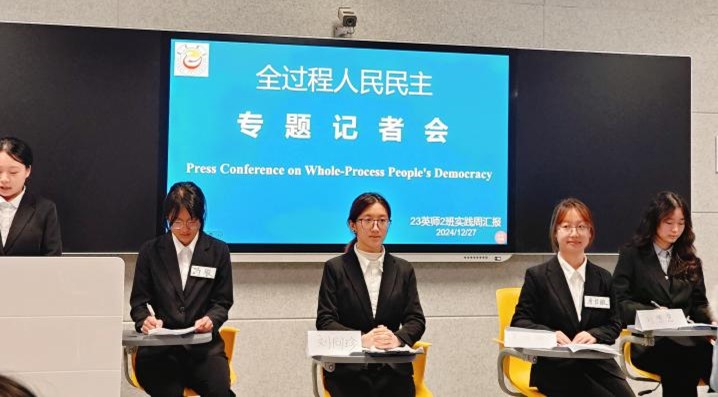 实践周期间,在石老师的指导和带领下,同学们认真阅读了主题文章,结合习题深入思考全过程人民民主的内涵。通过班级讨论,确定了采用召开全过程人民民主专题记者会的形式来汇报实践周学习成果。经过几天的准备,专题记者会展示活动于周五上午在智慧微格实训室举行,同学们穿上正装,佩戴好名牌,自信大方地扮演者记者会上的各种角色:身姿挺拔的主持人,谈吐自如的专家、发言人,亲切的人大代表,急切的中外记者,当然每组必不可少的就是展现出优秀职业素养的翻译员。形式上像模像样,内容上也绝不敷衍,各组聚焦全过程人民民主主题,或专注某一论题、或结合多个论题,发言、问答各个环节精彩纷呈,高潮迭起。